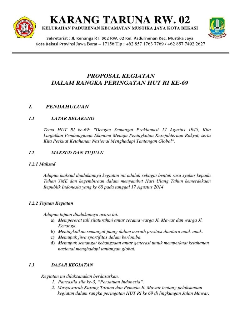 Maka dari itu, kami selaku panitia akan mengadakan peringatan hari ulang tahun kemerdekaan indonesia republik indonesia . Rt 03/rw 02 kelurahan kelapa gading barat. Prosedur penyusunan proposal kegiatan 17 agustus beserta contoh lengkapnya. Berikut ini beberapa contoh format proposal untuk acara 17 agustus di sekolah, masyarakat baik tingkat rt, rw, maupun untuk karang taruna . Contoh proposal kegiatan hut ri sekolah.